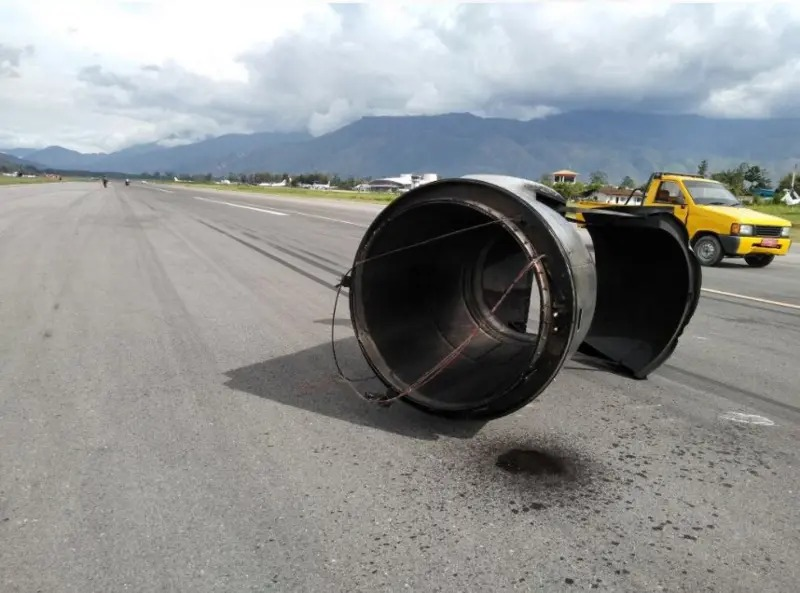 During the landing roll, the crew deployed the thrust reversers — a normal step to decelerate the aircraft on the relatively short, high-altitude runway. However, immediately after activation, the No. 2 engine’s thrust reverser clam shell doors, along with their supporting structure, separated from the aircraft.