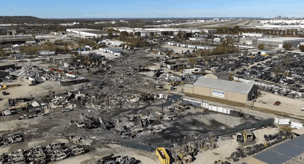 The accident site presents significant recovery challenges, as the aircraft came down in an industrial area containing an auto scrap yard (Grade A Auto Parts) and the Kentucky Petroleum Recycling company’s depot. The debris field stretches for approximately half a mile.